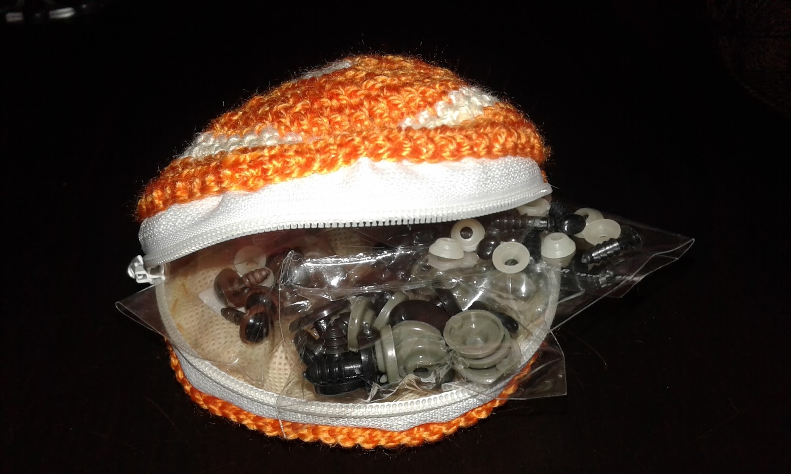 Cortamos una larga hebra para coser los ojos a la cara, fijamos y escondemos los sobrantes en el interior.